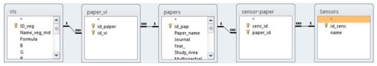 The design of the relational database played an important role in conducting the review. The three main tables (Papers, VIs and Sensors) are interconnected, and results can be extracted from all directions. After assigning the data to the database, it was possible to find out which platforms imagery each index have used, for example, which papers used NDVI from Sentinel-2 data, or which platform GNDVI have used for calculation and how many times. In conclusion, with the relational database we were able to access and answer every question that concerned us, during the design and writing.