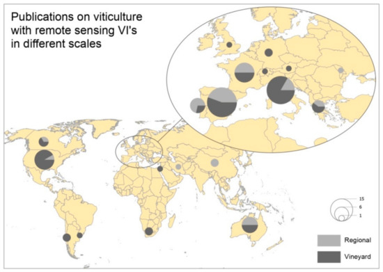 Spatially the research is on 19 countries (Figure 4), in countries that have more than 5 publications there are both scales, regional and site-specific (vineyard). The only country where more research has been conducted on the regional scale is Portugal, while 50–50 was on France and Australia. It is observed that the USA and Italy tend to do more research on the scale of the site-specific, while in the group of the other countries (Portugal, Spain, France, Greece, Australia) they research both on the site-specific and regional scale. It is worth to mention that the study areas are concentrated in latitude ±40 degrees due to the suitable climatic conditions for the development of the vineyards.