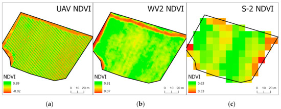 The usage for each platform depends on the price and the resolution of the imagery it offers. Satellites with high-resolution imagery offer detailed information for analyzing vineyards, but their price is a limiting factor mainly for multitemporal monitoring. In this case, medium-resolution free access satellites are used such as Sentinel-2 where with the resolution of 10 m × 10 m can reveal the spatial variability in the vineyard. Τhe Figure 5 shows the same vineyard from three different remote sensing data sources, (a) from UAV mounted multispectral camera with 3 cm pixel size, (b) from Worldview-2 with 0.5 m pixel size and (c) from Sentinel-2 with 10 m pixel size. In the first case we must have in our possession a UAV, to process the data and produce this NDVI map. In the second case of WV2 we have to purchase the satellite imagery, while when it comes for Sentinel-2 we can download it for free.