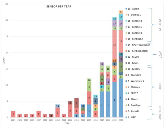 The examination of uses has two perspectives: firstly, the appearance of each technology and satellite, for example, UAVs, which have come to the fore after 2010, and secondly, the purpose of the research and the extent of the study area, viticulture region or field scale. Figure 6 demonstrates the usage of each platform per year. It is obvious that the numbers in the last years are greater due to the many publications, and also that aircrafts are replaced by UAVs. The need to extract the vine rows is captured in the high usage of ultra-high-resolution sensors (aircraft, UAV). Sentinel-2 and other medium resolution give an extra solution because of the free access and their spatial resolution which can display the variability in a vineyard [19]. The high-resolution satellites constitute a minor percentage in the research, due to restrictions such as the price and the controversial usage for vineyard row extraction.