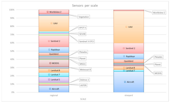 Because of the two categories on the scale of the study area, some satellites were suitable to be used only on regional scale due to their spatial resolution. For example, in order to perform an analysis on a viticulture region a Landsat series satellite is ideal concerning the spatial resolution it offers. Figure 7 demonstrates the percentage of usage for each platform in both scales. When the research is based on regional scale the usage of UAVs and aircraft reduced and their place is taken by Landsat satellites, MODIS and Worldview 2.