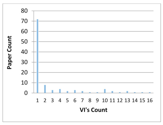 One to 16 different VIs have been used in each of the 113 reviewed papers (Figure 8). The usage of one or more VIs depends on the requirements of the research. 72 out of 113 have used only one vegetation index while NDVI appeared in 99 different papers. It is one of the oldest vegetation indices and the most widely used because of the simplicity of calculation, and this is the reason why all sensors have bands on red and NIR. The explanation of results is easy, and most publications have used it in a supportive way in the research, e.g., to extract the vine rows [71].