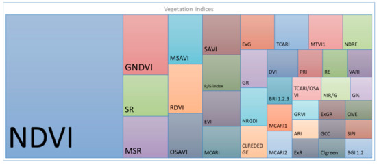 GNDVI was used 16 times, followed by SR and MSR with 11 references. Soil adjusted vegetation indices (SAVI, MSAVI, OSAVI) had about 10 references each on this review. SAVI and MSAVI are used most in medium and low-resolution imagery due to the ability to minimize soil brightness influences [127]. Figure 9 displays the usage of each vegetation index with 3 or more references. The area of the rectangle is proportional to the references of each VI.