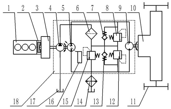 Sketch of the structure of the drive system of the hillside crawler tractor. 1. Engine; 2. Clutch; 3. Transfer case; 4. Charge pump; 5. Variable pump; 6. Filter; 7. Check valve; 8. Overflow valve; 9. Bidirectional hydraulic motor; 10. Drive rear axle; 11. Driving wheel; 12. Overflow valve; 13. Check valve; 14. Radiator; 15. Overflow valve; 16. Swashplate adjusting mechanism; 17. Oil tank; and 18. Hydrostatic transmission (HST).
