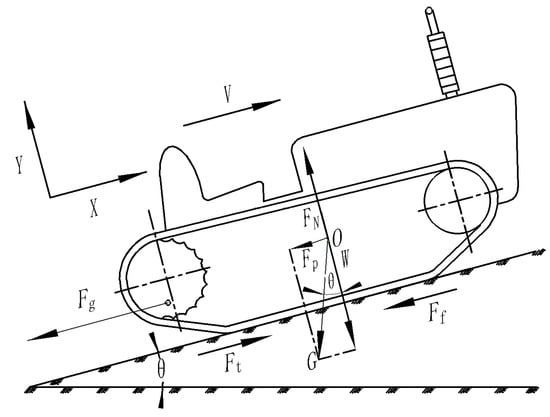 The external resistance of the crawler tractor includes the rolling resistance Ff from the ground, ramp resistance Fp when uphill, and drive resistance Fg []. The air resistance and the acceleration resistance is neglected due to the low speed. The driving resistance Ft which the tractor needs to be overcame when working is as follows: