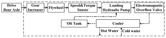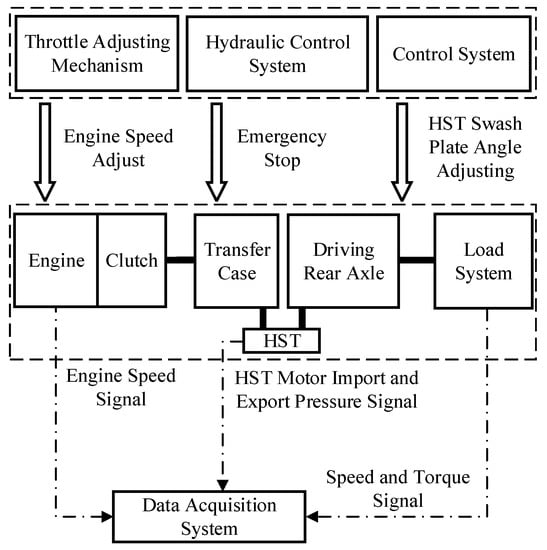 As shown in Figure 3, in the drive system test bench, the load system was connected to the driving wheel of the driving rear axle to apply torque to the drive system to simulate the working load of the tractor. The operator adjusted the engine speed by operating the throttle actuator. A hydraulic control system was used for emergency braking of the drive system test bench. The CoCo-90 dynamic data analyzer (Crystal Instruments Inc., Silicon Valley, CA, USA) was used for the data acquisition system. The control system consisted of the Arduino UNO single chip microcomputer (Arduino SA Inc, Ivera, Turin, Italy), HBS657 digital stepping closed-loop driver (Hongbaoda Electric Machine Co., Ltd., Shantou, Guangdong, China). and the step motor 57HB250-112BJ (Hongbaoda Electric Machine Co., Ltd., Shantou, Guangdong, China). The step motor was connected to the HST swash plate angle adjusting shaft through an NMRV30 worm reducer (Dongguan Yutian Electric Machine Co., Ltd., Dongguan, Guangdong, China) to control the displacement and the flow direction of the variable pump.