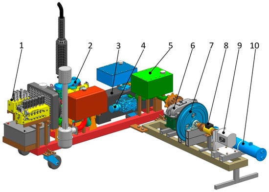 Test bench assembly drawing. 1. Hydraulic control system; 2. Engine; 3. Drive rear axle; 4. HST; 5. Fuel tank; 6. Gear Increaser; 7. Flywheel; 8. Speed & torque sensor; 9. Hydraulic pump; and 10. Cooler.