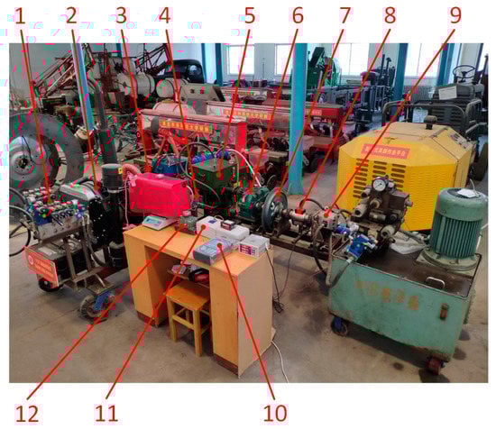 Test bench. 1. Hydraulic control system; 2. Engine; 3. Drive rear axle; 4. HST; 5. Fuel tank; 6. Gear Increaser; 7. Flywheel; 8. Speed & torque sensor; 9. Hydraulic pump; and 10. Data acquisition system 11. Control System. 12. Throttle Adjusting Mechanism.