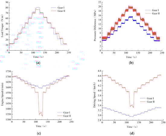 The results of the traction performance test were shown in Figure 7. It can be seen in Figure 7 that during the traction performance test of Gear I, the pressure difference between the inlet and outlet of the hydraulic motor were increased gradually from 5 MPa to 15 MPa, the engine speed was decreased gradually from 1700 r/min to 1600 r/min, and the driving speed was decrease gradually from 3.3 km/h to 2.9 km/h with the increase of the load torque from 10 N·m to 80 N·m, and during the traction performance test of Gear II, the pressure difference between the inlet and outlet of the hydraulic motor were increased gradually from 6 MPa to 19 MPa, the engine speed was decreased gradually from 1700 r/min to 1550 r/min, and the driving speed was decrease gradually from 4.6 km/h to 4.0 km/h with the increasement of the load torque from 10 N·m to 70 N·m, when the load torque increases from 70.0 N·m to 75.0 N·m, the range of the change in the engine speed exceeds 200 r/min, the test for the drive system was repeated several times, and it was found that the engine will often shut down when the Gear II load torque exceeds 75.0 N·m.