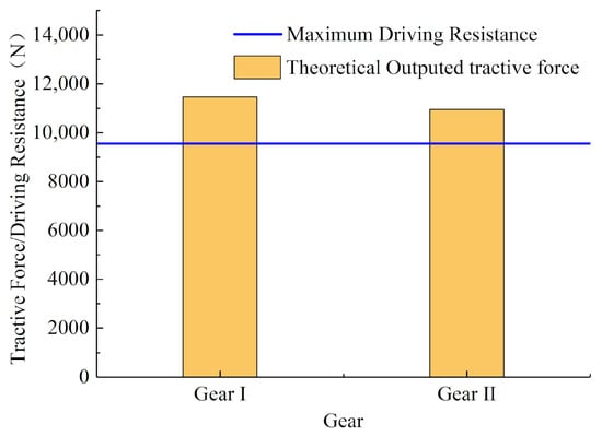 According to Figure 8, the theoretical outputted maximum tractive force of the tractor in the Gear I was 11,456.3 N, and the theoretical outputted maximum tractive force of the tractor in the Gear II was 10,959.2 N, which were larger than the traction resistance of 983.7 N experienced by the tractor ploughing on the slope.