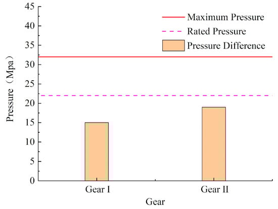 The working pressure of the HST should not exceed maximum pressure when working and cannot exceed the rated value when constantly performing heavy work. The inlet and outlet pressures of the hydraulic motor of the HST in the traction performance tests in the Gear I and Gear II of the tractor were compared with the rated pressure and maximum pressure of the system, and the comparison results are shown in Figure 9.