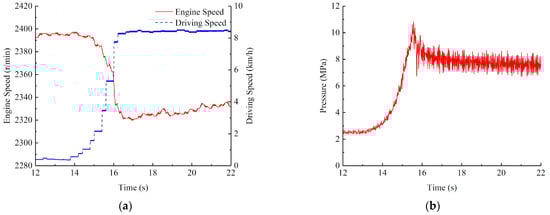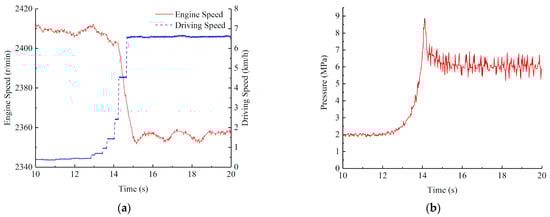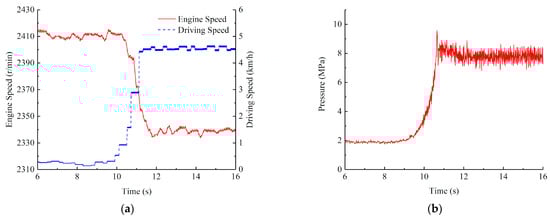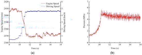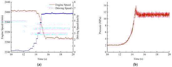 Parameters when starting on flat ground in Gear III: (a) change of the engine speed and driving speed; (b) change if the inlet and outlet pressure difference of the hydraulic motor.