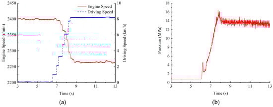 Parameters when starting on flat ground in Gear I: (a) change of the engine speed and driving speed; (b) change of the inlet and outlet pressure difference of the motor.
