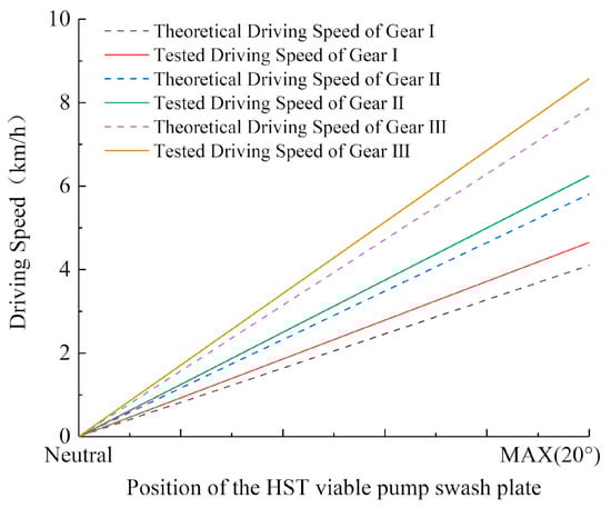 The test results of the starting acceleration performance on the slope are shown in Figure 13, Figure 14 and Figure 15. Figure 13a, Figure 14a, and Figure 15a show that the driving speed gradually increased with increasing swash plate angle of the HST variable pump. In the process of starting and accelerating, the engine speed first decreased and then remained stable. When the system reached a stability, the engine speeds at Gear I, Gear II, and Gear III were approximately 2330 r/min, 2280 r/min, and 2250 r/min, respectively, and the maximum driving speeds were approximately 4.55 km/h, 6.25 km/h, and 8.28 km/h, respectively. Figure 13b, Figure 14b, and Figure 15b show that in the process of starting and accelerating in Gear I, Gear II, and Gear III on the slope, the inlet and outlet pressure difference of the motor first increased sharply and then decreased, and finally stabilized at approximately 8.0 MPa, 12.0 MPa, and 14.0 MPa, respectively, with the increase of the swash plate angle of the HST variable pump.