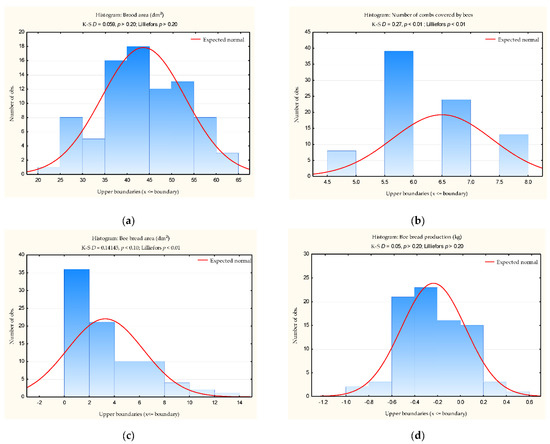 Data distribution: (a) brood area (dm2); (b) number of combs covered by honey bees; (c) bee bread area (dm2); (d) bee bread production (kg).