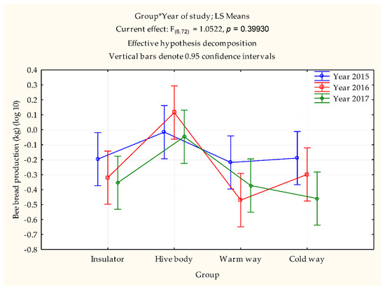 During the three-year study, 21 repetitions for each experimental group were conducted (Table 4). The significant differences were found between groups (F(3,72) = 10.999, p = 0.0000). The highest bee bread production per honey bee colony was found in the hive body group and amounted to 1.23 kg/colony, on average. Level of bee bread production of 0.6 kg per one colony was found in the group with the brood nest isolated with two insulators, and in the case of the warm way and cold way group, on average, 0.5 kg of bee bread was harvested. About 43% of the total amount of bee bread harvested from all of the colonies originated from the hive body group. The analysis of interaction between study years and the amount of bee bread harvested in individual groups did not show statistically significant differences (F(6,72) = 1.0522, p = 0.39930) (Figure 3).