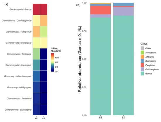 As many as 467 OTUs of AMF (after sequence alignment of OTUs) were grouped into 10 genera and 138 species, of which a total of 10 genera (Ambispora, Acaulospora, Archaeospora, Claroideoglomus, Diversispora, Gigaspora, Glomus, Paraglomus, Redeckera, and Scutellospora) and 133 species were found in the CR sample (Figure 4). As many as 9 genera (Ambispora, Acaulospora, Archaeospora, Claroideoglomus, Diversispora, Gigaspora, Glomus, Paraglomus, and Redeckera) and 114 species were observed in the CS sample (Figure 4). Compared with the CR sample, the CS sample failed to detect Scutellospora. The AMF genus Glomus was observed most dominantly in the CR sample with maximum relative abundance of 86.77%, followed by Paraglomus (7.48%), Claroideoglomus (3.00%), Diversispora (1.61%), Ambispora (0.62%), and Acaulospora (0.26%), respectively, in decreasing order. The remaining 4 genera viz., Archaeospora, Gigaspora, Redeckera, and Scutellospora, had a low relative abundance of 0.25%. In the CS sample, the relative abundance of Glomus was 88.59%, followed by Claroideoglomus (7.73%), Diversispora (2.83%), and Paraglomus (0.84%), respectively. The rest of the other genera such as Ambispora, Acaulospora, Archaeospora, Gigaspora, and Redeckera made very low contributions (up to 0.01%). The genus Glomus was the dominant genus in both CR and CS samples. The relative abundance of Paraglomus was relatively higher in the CR sample than in the CS sample, and the relative abundance of Claroideoglomus and Diversispora in the CR sample was substantially lower than that in the CS sample.