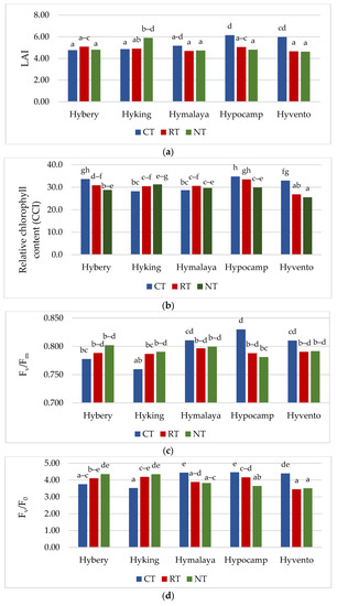 The leaf area index (LAI), which determines the coverage of the canopy, is the most important parameter reflecting the dynamic growth rate of crops. The LAI determines the size of the area of photosynthetic active radiation (PAR) on which the effectiveness of the photosynthesis process depends [38]. The LAI achieved the highest value in the CT system compared to other tillage systems, by 10.3% (RT) and 8.3% (NT), respectively (Table 4). A similar relationship in studies with spring wheat was obtained by Kulig et al. [39], where this ratio was higher by an average of 12.0% for facilities in the CT system compared to RT. Liu et al. [40] also showed that, regardless of the wheat cultivar tested, a higher LAI value was obtained in the CT system compared to NT. Cv. Hypocamp obtained a higher LAI value compared to cvs. Hybery (by 9.2%), Hymalaya (by 9.7%) and Hyvento (by 4.7%). A statistically significant interaction between the experimental factors in shaping the value of this parameter was found. The highest value of LAI was achieved by cvs. Hypocamp (6.1) and Hyvento (6.0) in the CT system and Hyking (5.9) in the NT system (Figure 2a).