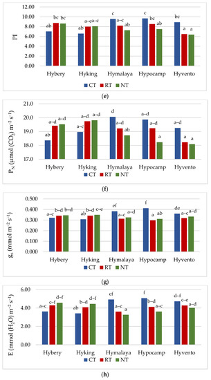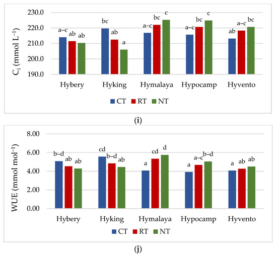 For all gas exchange parameters, statistically significant interactions between the tillage systems and cultivars were found. The highest values of gs and E were obtained by cvs. Hymalaya, Hypocamp and Hyvento and PN by cvs. Hymalaya and Hypocamp in the CT system (Figure 2f–h). However, in RT, and in particular NT, these cultivars were characterised by the lowest values of these parameters. In contrast, cvs. Hybery and Hyking responded better to cultivation in RT and NT systems than in CT systems. The Ci parameter reached the highest value for cvs. Hymalaya and Hypocamp in NT compared to cvs. Hyvento in CT, Hyking in RT and NT, and Hybery in RT and NT (Figure 2i). The WUE index, on the other hand, achieved the highest value for cv. Hymalaya in NT and the lowest for cvs. Hymalaya, Hypocamp and Hyvento in CT (Figure 2j).