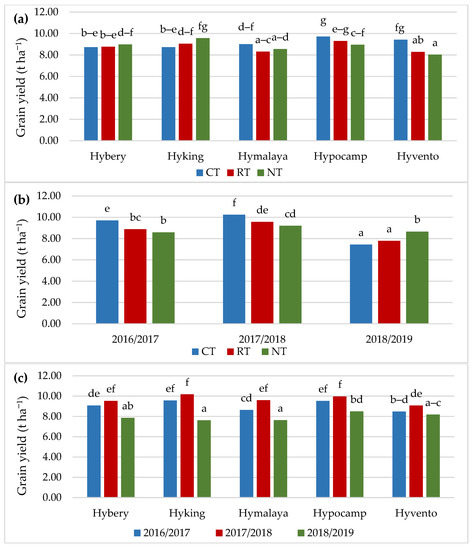 Cv. Hypocamp was characterised by a higher grain yield compared to cvs. Hybery, Hymalaya and Hyvento; however, cvs. Hymalaya and Hyvento yielded the lowest (Figure 3a). In the CT system, the highest grain yield was obtained by cvs. Hypocamp (9.72 t ha−1) and Hyvento (9.43 t ha−1), and in the NT cv. Hyking (9.58 t ha−1). The lowest grain yield was found for cvs. Hyvento (8.29 t ha−1 in RT and 8.03 t ha−1 in NT) and Hymalaya (8.30 t ha−1 in RT and 8.55 t ha−1 in NT). Cv. Hybery obtained grain yield at a similar level in all tillage systems. However, in the case of cv. Hyking, a 9.7% higher grain yield was found in NT compared to CT.