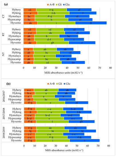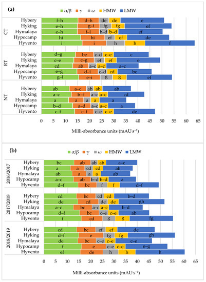 The grain of the cultivars from the CT system, compared to RT and NT, contained significantly more α/β, γ subunits (except for cvs. Hybery and Hymalaya) and ω gliadins as well as HMW and LMW glutenins, and also the sums of gliadins and glutenins (Figure 4a and Figure 5a).