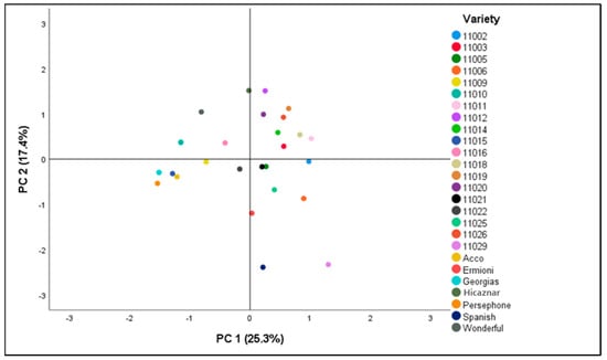 According to our PCA results (Table 4 & Figure 1), traits related to fruit, aril and seed had the most discriminating power (PC1 and PC2). These results agree with previous studies that reported the importance of color, juice characteristics and fruit size [,,,]. According to PCA, correlation was detected between fruit traits and chemical properties and more specifically, PC2 related antioxidant content to aril color.