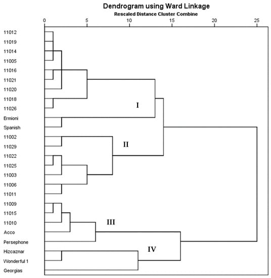 According to the Hierarchical Cluster Analysis, the 26 genotypes studied were placed in 4 clusters (Figure 2). The first cluster (I) contained genotypes maintained in the ex situ collection at the Department of Deciduous Fruit Trees in Naoussa (11012, 11019, 11014, 11005, 11016, 11021, 11020, 11018, 11026), along with Ermioni and Spanish cultivars forming a subcluster. Genotypes 11002, 11029, 11022, 11025, 11003, 11006, 11011 formed a second cluster (II), while 11002 and 11029 formed a subcluster. The third cluster (III)is also composed of ex situ genotypes (11009, 11015, 11010) along with cvs Acco and Persephone. Finally, the fourth cluster (IV) contained cvs Hicaznar, Wonderful 1 and Georgias.