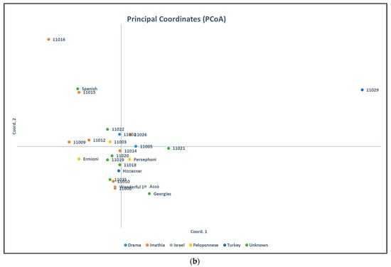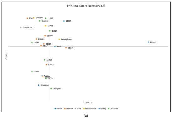 Scoring of the DNA profiles was performed and the bands of DNA fragments for ISSR and SCoT markers were classified as present (1) or absent (0). Data were analyzed using GenAlEx 6.5 [,], an Excel add-in for the genetic analysis, separately for each molecular marker. Band frequencies were also calculated for each group of pomegranates depending on their origin. Genetic distance matrices were calculated, and further genetic analyses were performed, including: Analysis of Molecular Variance (AMOVA) and Principal Coordinates Analysis (PCoA). The genetic distance matrix of each molecular marker was used for the construction of the UPGMA tree with MEGA X []. All the above statistical analyses were repeated also for the distance matrix that resulted from the combination of the ISSR and SCoT data.