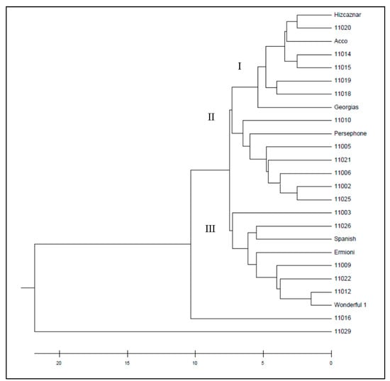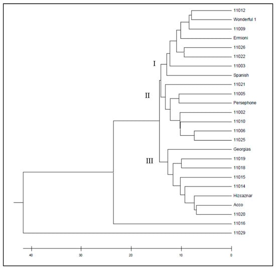 Hierarchical Cluster Analysis showed that most of the genotypes contained in the first cluster, are characterized by high values of % juice/edible portion, while the second cluster is composed of genotypes maintained in the ex situ collection. Cvs 11002 and 11029 formed a subcluster that may be due to their lowest values of % juice/edible portion. Hicaznar, Wonderful 1, and Georgias showed low values of TSS and MI and formed a fourth cluster. Cluster analysis revealed low variability among the cultivars studied, which may be due to the close relatedness of many of the genotypes. More morphological data on leaf, flower, and fruit along with other characteristics, such as harvest time and flowering time would allow an even higher characterization of pomegranate cultivars based on the phenotypic traits.