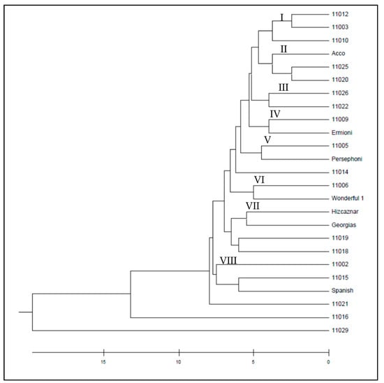 Phenotypic observations on morphological traits are implemented traditionally and are useful for preliminary evaluation of pomegranate genotypes because it is a fast and simple method and can be used as a general approach for assessing genetic diversity. Implementing multivariate statistical methods, as principal component analysis (PCA) and cluster analysis of the phenotypic data, can be very valuable for screening cultivars, as mentioned in studies with almond [], Cerasus subgenus [] and pomegranate [,]. Furthermore, DNA molecular markers, such as Inter Simple Sequence Repeats (ISSR), provide valuable information on the genetic diversity and genetic relationships of plants. The availability of information on the genetic relationships between varieties and/or accessions is very important for breeding programs. Different molecular markers, such as RAPD, RFLP, AFLP, SSR, ISTR, ISSR, and SRAP, which vary in their complexity and the generation of polymorphic bands, were used efficiently to determine genetic diversity among pomegranate cultivars [,,,,].