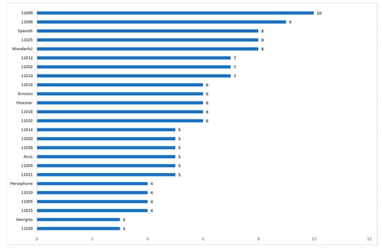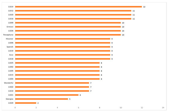Data about the world total area and world total production are not available due to the rapid increase in cultivation occurring during the recent years. In 2014 it was estimated to be around 3 million tons and in 2017 around 3.8 million tons []. According to the data collected by the Hellenic Statistical Authority [], pomegranate cultivation in Greece counts 1,582,872 trees and their production extends almost 42,000 tons. In Greece, pomegranate was traditionally grown in Peloponissos, southern Greece, using the local cv. Ermioni, while new plantations were recently established throughout the country using mainly the cv Wonderful and to a lesser extent Hicaznar, Acco and No 116/17.