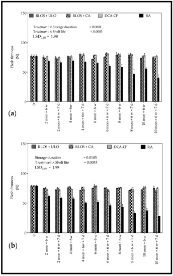 Firmness (N) of ‘Granny Smith’ apples harvested in the 2015 (a) and 2016 (b) seasons at commercial maturity and stored for up to 10 months at 0 °C in various storage conditions, evaluated every two months followed by a 6 week simulated shipment and handling period, and at 7 days on the shelf (20 °C and 65% RH). Vertical bars represent the standard error (SE) of mean values of 3 replicates (1 replicate = 10 fruit). LSD0.05 represent least significant difference (p < 0.05). For storage duration, mon—months, w—weeks, and d—days. RLOS—repeated low oxygen stress; ULO—ultra-low oxygen; CA—controlled atmosphere; DCA-CF—dynamic controlled atmosphere-chlorophyll fluorescence; RA—regular atmosphere.