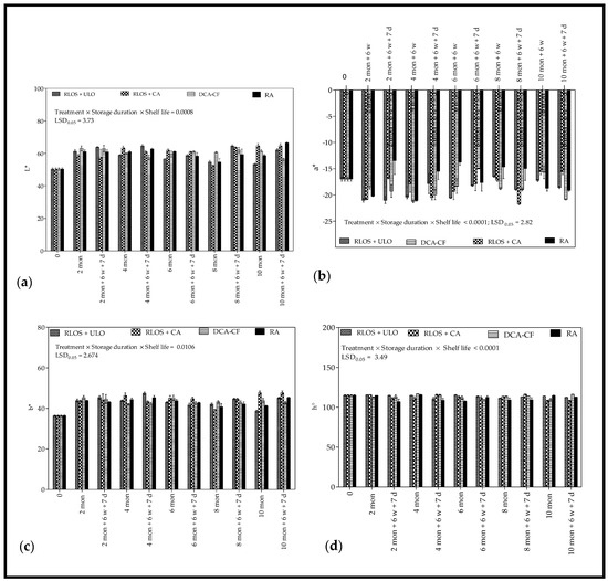 Background color (a) lightness (L*), (b) redness/greenness (a*), (c) yellowness/blueness (b*) and (d) hue angle (h°) of ‘Granny Smith’ apples harvested in the 2016 season at commercial maturity and stored for up to 10 months at 0 °C in various storage conditions, evaluated every two months followed by a 6 week simulated shipment and handling period, and at 7 days on the shelf (20 °C and 65% RH). Vertical bars represent the standard error (SE) of mean values of 3 replicates (1 replicate = 10 fruit). LSD0.05 represents least significant difference (p < 0.05). For storage duration, mon—months; w—weeks; and d—days. RLOS—repeated low oxygen stress; ULO—ultra-low oxygen; CA—controlled atmosphere; DCA-CF—dynamic controlled atmosphere-chlorophyll fluorescence; RA—regular atmosphere.