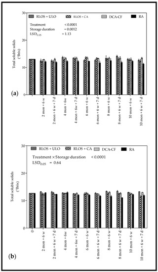 Total soluble solids (°Brix) of ‘Granny Smith’ apples harvested in the 2015 (a) and 2016 (b) seasons at commercial maturity and stored for up to 10 months at 0 °C in various storage conditions, evaluated every two months followed by a 6 week simulated shipment and handling period, and at 7 days on the shelf (20 °C and 65% RH). Vertical bars represent the standard error (SE) of mean values of 3 replicates (1 replicate = 10 fruit). LSD0.05 represents least significant difference (p < 0.05). For storage duration, mon—months; w—weeks; and d—days. RLOS—repeated low oxygen stress; ULO—ultra-low oxygen; CA—controlled atmosphere; DCA-CF—dynamic controlled atmosphere-chlorophyll fluorescence; RA—regular atmosphere.