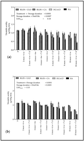Overall, RLOS (ULO and CA) and DCA-CF maintained TSS content significantly higher than RA during long term storage. The results were in accordance with Rebeaud and Gasser [40], who reported higher TSS content in DCA-CF stored ‘Golden Delicious’ apples compared to RA stored fruit after 16 and 36 w of cold storage. Titratable acidity content of ‘Granny Smith’ apples usually decreases as storage duration is extended [43]. The use of fruit organic acids in respiration during storage has been suggested as the cause for decreases in TA content [44,45,46]. The RLOS (ULO and CA) and DCA-CF treatments reduced the decline in TA as storage duration was extended whilst there was a general decrease in TA content during storage of RA treated fruit. These results agree with Mditshwa et al. [9], who reported that ‘Granny Smith’ apples stored in repeated DCA-CF had higher TA levels compared to RA stored fruit. Similarly, Lafer [47] reported that DCA-CF storage maintained firmness and TA content at higher levels for ‘Uta’ pears compared to standard CA.