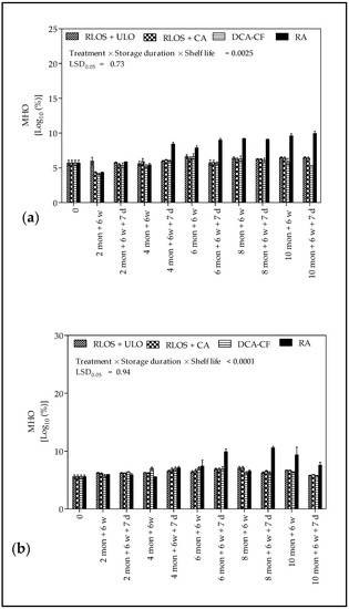 Accumulation of MHO (Log (%)) of ‘Granny Smith’ apples harvested in the 2015 (a) and 2016 (b) seasons at commercial maturity and stored for up to 10 months at 0 °C in various storage conditions, evaluated every two months followed by a 6 week simulated shipment and handling period, and at 7 days on the shelf (20 °C and 65% RH). Vertical bars represent the standard error (SE) of mean values of 3 replicates (1 replicate = 10 fruit). LSD0.05 represents least significant difference (p < 0.05). For storage duration, mon—months; w—weeks; and d—days. RLOS—repeated low oxygen stress; ULO—ultra-low oxygen; CA—controlled atmosphere; DCA-CF—dynamic controlled atmosphere-chlorophyll fluorescence; RA—regular atmosphere.