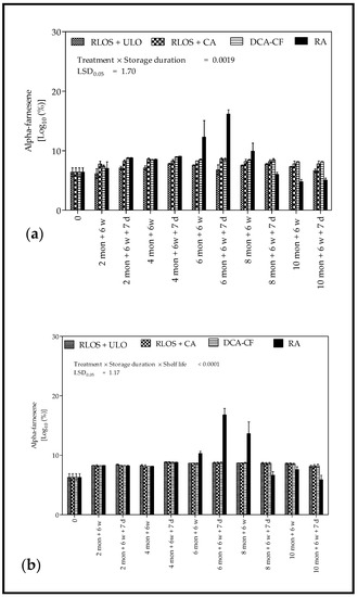 The greater accumulation of MHO observed for RA treated peels compared to RLOS (ULO and CA) and DCA-CF stored apples was consistent with results reported by Mditshwa et al. [2] for ‘Granny Smith’ apple peels subjected to repeated DCA-CF storage for up to 6 w at −0.5 °C and 95% relative humidity (RH). Additionally, Ramokonyane [14] outlined that optimally harvested ‘Granny Smith’ apples stored in RA at 0 °C for up to 7 months had markedly higher MHO concentration compared to DCA-CF and CA, preceded by initial low oxygen stress (ILOS + CA) stored fruit. Studies have reported that superficial scald is related to the extent of α-farnesene oxidation in susceptible apple cultivars [1,2]. Therefore, the accumulation α-farnesene in apple peels is expected to vary with storage duration as oxidative products increase.