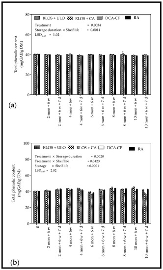Total phenolic content (mgGAE/g DM) of ‘Granny Smith’ apples harvested in the 2015 (a) and 2016 (b) seasons at commercial maturity and stored for up to 10 months at 0 °C in various storage conditions, evaluated every two months followed by a 6 week simulated shipment and handling period, and at 7 days on the shelf (20 °C and 65% RH). Vertical bars represent the standard error (SE) of mean values of 3 replicates (1 replicate = 10 fruit). LSD0.05 represents least significant difference (p < 0.05). LSD0.05 represent least significant difference (p < 0.05). For storage duration, mon—months; w—weeks; and d—days. RLOS—repeated low oxygen stress; ULO—ultra-low oxygen; CA—controlled atmosphere; DCA-CF—dynamic controlled atmosphere-chlorophyll fluorescence; RA—regular atmosphere.