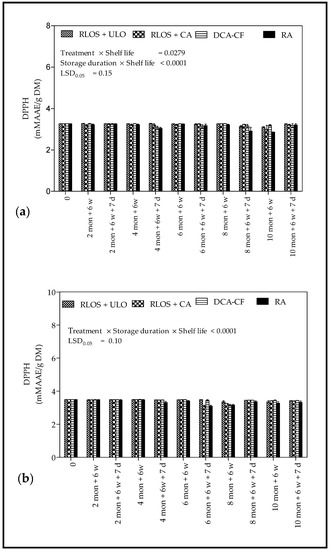 In the 2015 season, significantly lower antioxidant activity in RA than in RLOS (ULO and CA) and DCA-CF sampled peels was recorded after 4, 8, and 10 months (Figure 9a). The RSA generally fluctuated during RLOS (ULO and CA) storage and DCA-CF treated peels, with no significant change. For RLOS (ULO and CA) and DCA-CF treated peels, there was no substantial difference in RSA between 0 and 7 d shelf life. As previously observed in the first harvest season (2015), RSA was stable for RLOS (ULO and CA) and DCA-CF treated peels in the 2016 season (Figure 9b). However, between 4 and 8 months of storage, a significant decrease in RSA was observed after 7 d shelf life for RA treated peels.