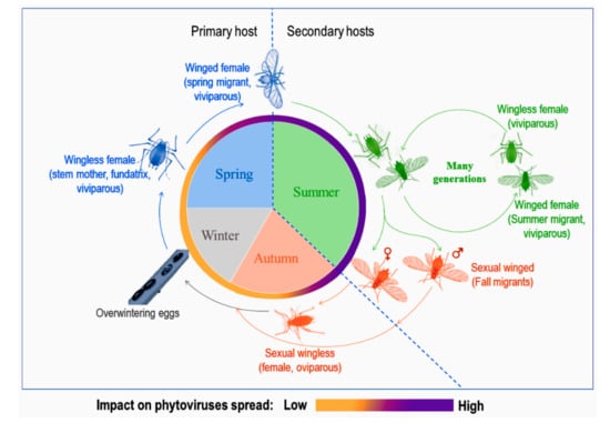 Aphid life cycles are known to be diversified with several morphological forms associated to different host plants according to the season and environmental conditions (see the review in [] and Figure 1). Depending on their mobility, adults are either winged or wingless. Winged morphs, especially spring and summer migrants, are known to be important in conquering new hosts, establishing new colonies and, at the same time, responsible for spreading phytoviruses over long distances. Spring migrants transmit phytoviruses acquired from alternate hosts in early spring to crop plants while summer migrants transmit phytoviruses within the field from one plot to another, more or less distant, during plant-to-plant movements over several generations []. As for wingless, they spread the infection by walking from one plant to another in the vicinity of the initially colonised plant []. Finally, fall migrants are involved in the transmission of new phytoviruses which were acquired in the field from distant sources to the alternate hosts (reservoir plants) []. Therefore, the emergence of winged forms would be favourable to the further phytoviruses spread.