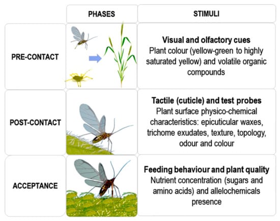 Depending on the vector’s location and the ways in which it communicates with its host plant, the HSB can be categorised into the following three phases: (1) pre-contact, (2) post-contact, and (3) acceptance (Figure 2).