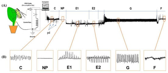From the search for a feeding site to sustained phloem-feeding, aphids penetrate the plant with their stylets while salivating. They reach different plant tissues in several stages, in particular xylem and phloem, where they feed by sucking sap. These different stages specifying the activities of the stylets and the time spent in different plant tissues define the aphid FB. The latter is studied using an electropenetrography (EPG) system (Figure 3). Electrical waves generated by stylet activities in plant tissues are amplified and recorded on a computer. Combined with histological sections, patterns of EPG waveforms have been associated with different stylet positions in plant tissue and feeding activities []. Seven waveforms for aphids were defined by Tjallingii and Prado []: (1) probing (probe) and non-probing (np) waveforms; (2) intercellular stylet pathway and salivation (C); (3) potential drop (pd) caused by intracellular stylet punctures during C phase; (4) salivation into phloem (E1); (5) passive phloem sap uptake (E2); (6) active intake of xylem sap (G); and (7) stylet penetration difficulties (F) [,,]. These parameters refer to the analysis of EPG variables corresponding to the duration and number of occurrence of events generating different waveforms (non-sequential parameters) as well as sequential parameters related to specific sequences of these waveforms. More than one hundred and twenty variables can be analysed in aphid FB study, which can be found in [].