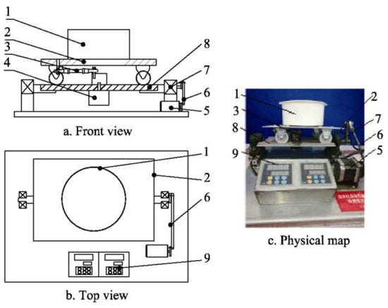 Structure and physical diagram of the 2-degree-of-freedom collision tester. (a) Front view of the tester; (b) Top view of the tester; (c) Physical map of the tester. 1. Material box, 2. Upper plate, 3. Crank slide mechanism, 4. Motor 2, 5. Motor 1, 6. Crank rocker mechanism, 7. Bearing, 8. Lower plate, and 9. Controller.