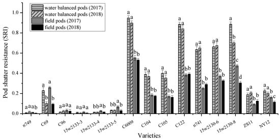 Pod shatter resistance index (SRI) values of the main inflorescence pods of two types (indoor water-balanced pods and field pods) according to the 2-degree-of-freedom collision method in 2016–2018. Lowercase letters indicate that the SRIs differ significantly within one variety based on Fisher’s protected LSD (p = 0.05).