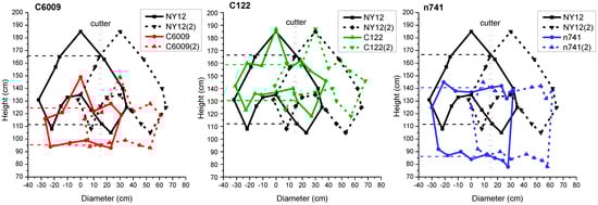 Comparison of the shapes of the pod layers of C6009, C122, and n741 with the commercial variety NY12. The horizontal axis represents the coordinate of the pod layer, where the value “0” corresponds to the main inflorescence of rape; for n741, zero corresponds to the middle position of the whole pod layer because it had more than one main inflorescence. The vertical axis represents the height of the pod layer above the ground. The dashed line (2) represents the pod layer of adjacent rape plants with a planting space of 30 cm. The pink dash-dotted line corresponds to the vertical cutter and intersects with the pod layer, and the corresponding longitudinal height range of the left dash-dotted line at its intersection is the height of the cutting pod layer of each variety at harvest.