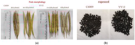 Comparison of morphology of the dehydrated and non-dehydrated pods and rapeseeds of C6009 and YY12. (a) Comparison of pods morphology. (b) Comparison of seeds morphology.