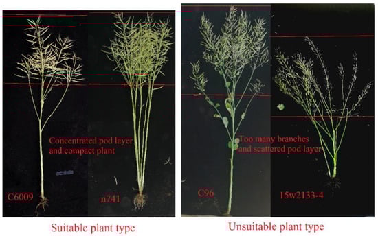 The plant types of the selected representative varieties suitable for mechanical harvesting and those not suitable for mechanical harvesting are illustrated in Figure 5. The mechanized combine harvesting test proved that the harvest loss of C6009 was significantly less than that of commercial varieties; however, its yield was slightly lower than that of the check variety, although with no significant difference. Studies have found that the larger TSW of rapeseed leads to lower shell yield and higher oil content []. TSW of C6009 was significantly larger, and its oil content was potentially higher. We found that although n741 did not possess a conventional rape plant structure, its main inflorescence was not readily observable with a consistent inflorescence height, similar to many rice or wheat plants that are clustered together. Therefore, the entanglement between plants may be insignificant, the yield was higher, and the pod resistance was relatively satisfactory. Theoretically, this plant type is also suitable for mechanized harvesting. However, due to insufficient seed quantity, it is impossible to plant n741 plant in a large area and conduct field harvest tests, leaving the problem of whether the loss is smaller to be determined.