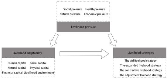 Under the background of global climate change, scholars have done a lot of research on livelihood adaptation from different perspectives. The research topics mainly include the driving mechanism of livelihood strategy, exploring the impact of rural households’ assets and risks on livelihood strategy [11,28,29]. The research topics mainly include livelihood resilience, exploring how individuals, communities, or countries use the comprehensive functions of adaptation, absorption, and transformation capabilities at different levels to improve livelihood resilience [30,31,32]; The research topics also include the calculation of livelihood vulnerability indices, establishing a livelihood vulnerability indicator system from three perspectives of exposure, sensitivity, and adaptation and quantifying vulnerability indicators with a view to develop differentiated livelihood strategies for different sensitive areas [33,34,35]. The study subdivides generalized agriculture (such as agriculture, forestry, animal husbandry, sideline, and fishery) and develops matching livelihood strategies for different types of farmer groups [36,37,38]. These studies play an important role in understanding the behavioral logic behind the choice of livelihood strategies of farm households [39,40,41,42]. Among them, timely adjustment of livelihood strategy is the most effective way to provide protection against stress for individuals and households [24,43,44], and it is also the key to the study of livelihood adaptability. Under the background of extensive environmental pressure, there have been many types of research on livelihood strategy in the academic circle [45,46,47], which mostly focus on floods [48,49,50], droughts [39], storm surges [51], hurricanes [52], and other disasters. The research contents mainly involve the correlation between livelihood capital and livelihood strategy [53], the impact of livelihood risk on livelihood strategy [54], and the measurement of livelihood vulnerability [55]. Therefore, research on rural households’ livelihood strategies under the background of earthquake disasters needs to be supplemented and improved [16,56], the characteristics of livelihood pressure, livelihood adaptability, and livelihood strategy choice of rural households and the correlation among them need to be further explored.