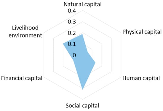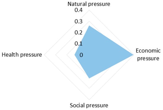 Figure 2 shows the radar chart of the household livelihood pressure composite index. As can be seen from Figure 2, the livelihood pressure of rural households is dominated by economic pressure (0.4), followed by natural pressure (0.26), health pressure (0.21), and the least social stress (0.13). Figure 3 shows the radar chart of the comprehensive index of farmer’s adaptive ability. As can be seen from Figure 3, social capital scored the highest (0.32), followed by livelihood environment (0.21), human capital (0.14), financial capital (0.10), and physical capital scored the lowest (0.06).