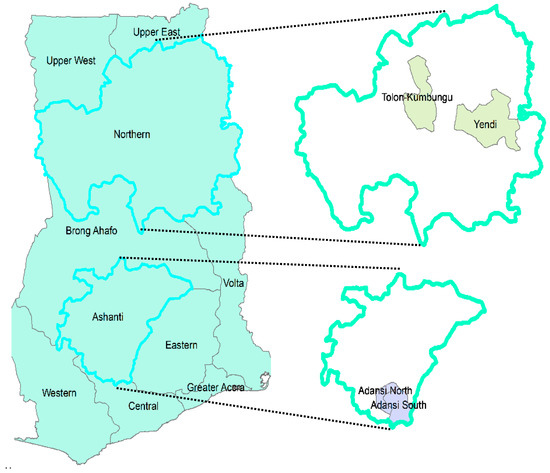 - Ghana Statistical Service. 2010 Population & Housing Census: Regional Analytical Report; Ghana Statistical Service: Accra, Ghana, 2013; Volume 1. [Google Scholar]